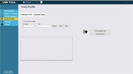 Training Once the profile is created, train your Watson profile with this tool. For Better text quality, IBM Watson demands two types of training – Language and Acoustic. Language Training needs to be completed first. Upload as many available text (speech converted) files of the dictator for language training. After successful completion of language training, we can move forward to acoustic training. Acoustic training requires a minimum of 10 minutes of audio and maximum 50 hours of audio. This is a time consuming process.