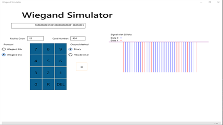 Calculates the Weigand bit sequence given a pair of numbers facility/badge id. It displays the corresponding oscilloscope output. It allows calculation based on Weigand 26x and Weigand 35x access control protocols.