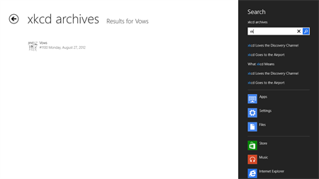 Fully functional xkcd archive browser, with live tile updating you on latest comic. Share and Search charms enabled.