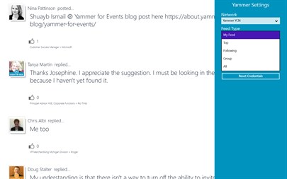 YamFall for Windows 8 provides a view of posts from a specified group or feed that is continuously updated as new posts are created by the users of corporate networks or external networks. At your next event, connect this app to a large screen and display a live feed of the posts from your attendees.