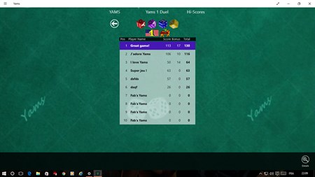 Adaptation of the famous dice game, YAMS provides a wide range of game experiences. Several types of games are proposed with the opportunity to add extended game modes. For example the PLUS mode allows you to improve your score, whereas the DUEL mode enables two players to compete on the same grid. Combined versions are also available to play several grids in a row in a same game. Up to 6 players, this game offers a TOP TEN list for each game type coupled with a mode. In all, 7 versions + 7 combinations associated with 4 modes are provided.
