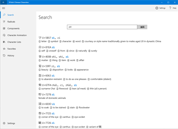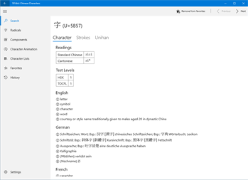 The 101dict Character Dictionary provides detailed information such as translations, Unihan data, and stroke order animations for more than 9,500 Chinese characters. You can enter characters directly or search for characters. The character search supports the input of Chinese characters, Pinyin, Zhuyin (Bopomofo), or Jyutping as well as the input of text in German, English, French, or Hungarian.