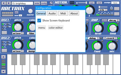 A software synthesizer. It is designed to allow as much as possible intuitive sound edition. There is a unique motion control function applied for each knob, giving the temporal change of tone by rotating the knob while voicing. You can use external MIDI keyboards to play tones.