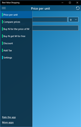 App will do for you: - Calculate price per unit (kilogram, gram, ounce, pound, liter, milliliter, fluid ounce) or per item (when buying in packs) - Automatically convert between different units of measurement - Compare items based on price-per-unit or price-per-item values - Estimate how much you save on "buy 3 for the price of 2", "buy 4 get 1 free" sales and similar - Subtract discount from the price-tag - Increase the price on the added tax value