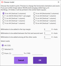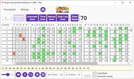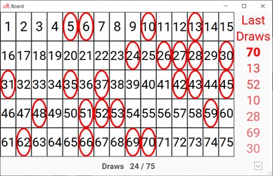 Free application for the management of Bingo tournaments. Support Bingo 30, 52, 60, 80, 90, 100, and 75 (with cards of 24 or 25) numbers. Can act as bingo caller. Multilanguage EN/ES/IT/FR/PT/RU.