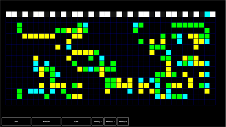 [Button] - Start/Stop : Start or Stop game - Random : set random cells - Clear : clear all cells - Memory 1 : load or store cells (1) - Memory 2 : load or store cells (2) - Memory 3 : load or store cells (3)