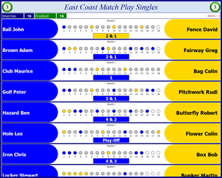 The system supports many types and formats of play: match play (with and without qualification groups), stroke play, league (match play and stroke play), yellow ball, 1-2-3, n Best Rounds and more using various scoring systems (gross, nett, Stableford, user defined points, etc.). If during the competition electronic scorecards are used (BQGolf MScorecard) then the players on their mobile devices enter hole results which are automatically transmitted to the main program (BQGolf) and then displayed on the leaderboard and distributed to all devices using applications BQGolf Viewer or BQGolf MViewer. The progress of the match or the whole competition can be watched in real time on TV/Projector at the club house and anywhere in the world on mobile and desktop devices. If electronic scorecards are not used then after a round/match the administrator (pro) easily enters the scores or match results on his console using the main program (BQGolf). In cup match play competitions the competition’s diagram is updated automatically.