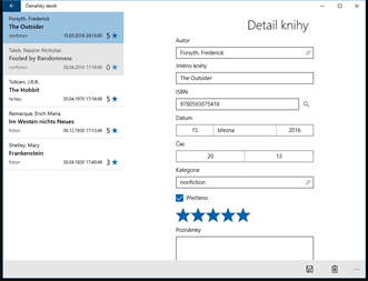 S aplikací Čtenářský deník budete mít přehled o knihách, které jste si přečetli nebo čtete. Naskenujte čárový kód pro vyhledání a automatické vyplnění názvu knihy a autora. Nebo tyto informace můžete vložit ručně, stejně jako si vytvořit vlastní kategorie, napsat k knihám poznámky a dát jim hodnocení. Zvolte si způsob řazení. Uložené knihy můžete filtrovat podle názvu knihy, autora, kategorie a toho, zda je kniha přečtená. Zálohujte knihy na paměťovou kartu nebo do cloudového úložiště. Čtenářský deník je univerzální aplikací a spustíte jej na mobilech, tabletech i počítačích s Windows 10.