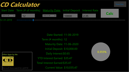 CD Calculator is a Windows 10 application that computes the value of a (CD) Certificate of Deposit.