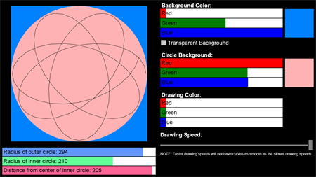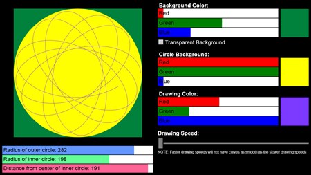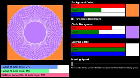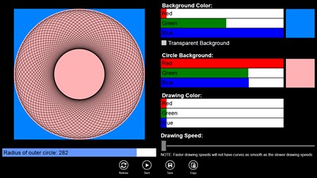 Curves Gone Wild is a simulator of the popular children's toy in which one circle rolls around inside another drawing a design of a continuous curved line. The app allows you to choose all three values for drawing the line, as well as choose colors for the background of the entire area (the corners of the design), the background of the circle in which the design is drawn, and the color of the line itself. You can also adjust the drawing speed and save an image of the design to your hard drive or SkyDrive, or copy it to the Clipboard using the Copy Button on the App Bar.