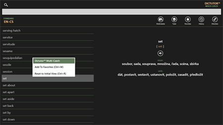 Dictutor MULTI-CS je obdivuhodný svazek 6 offline slovníků s elektronickým učitelem pro česky mluvící uživatele. Je to výkonný nástroj pro zvládnutí cizích jazyků. Dictutor vám umožňuje okamžitě překládat a efektivně se učit nová cizí slova.