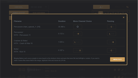 Merge audio files, summing the L/R channels, create sample chains, edit the samples individually, or as a batch with the selected actions list.