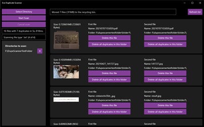 Features of the Eve Duplicate Scanner app: - Compares file content, not just file names - Compare files in multiple folders or disks that you select - Delete single duplicates or batch delete all duplicates in a folder