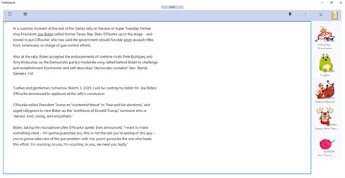 FastNotepad is a simple notepad developed to help those who need to edit text files a lot. The texts are saved as regular text files and they are visible to any file browser or file manager. Edit your text files easily with FastNotepad!