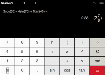 - Kalkulačka provádí sčítání, odečítání, násobení, dělení a umocňování zlomků, smíšených, desetinných a celých čísel. - Intuitivní způsob zadávání zlomků. - Kalkulačka počítá příklady se závorkami, včetně příkladů se složenými závorkami. - Sin, Cos, Tan. - π (pi). - Trigonometrické výpočty ve stupních a radiánech. - Můžete převést zlomky na desetinná místa a desetinná čísla na zlomky. - Můžete zjednodušit zlomky a smíšené číslice. - Aplikace zobrazuje jak výraz, tak výsledek. - K dispozici je také funkce historie výpočtů. - Je zde i možnost posílat výpočty emailem. - Funkce zaokrouhlování na určitý počet desetinných míst. Automaticky je aplikace přednastavena na 2 desetinná místa. - Možnost zaokrouhlování zlomku (výsledku) na nejbližší 1/2, 1/4, 1/8, 1/12, 1/16, 1/32, 1/64, 1/128, 1/256.