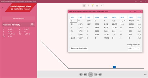 Aplikace „Translační pohyb tělesa po nakloněné rovině“ umožňuje simulaci pohybů na nakloněné rovině a „dojezdu“ tělesa po vodorovné rovině navazující na konec nakloněné roviny. Po zadání vstupních podmínek můžeme studovat pohyb tělesa po nakloněné rovině. Pohyb můžeme kdykoliv zrychlit, zpomalit či zastavit. Jsou zobrazovány aktuální hodnoty fyzikálních veličin, které možné si přehledně zobrazit v tabulce.
