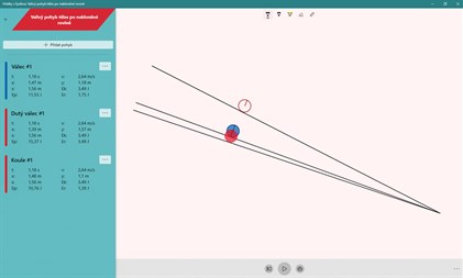 Aplikace „Valivý pohyb těles po nakloněné rovině“ simuluje tento pohyb v závislosti na zadaných vstupních podmínkách. Pohyby můžeme kdykoliv zrychlit, zpomalit či zastavit. Jsou zobrazovány aktuální hodnoty fyzikálních veličin, je možnost si je přehledně zobrazit v tabulce. Je možné například zjistit, při jakých sklonech nakloněné roviny se budou pohybovat tělesa o různém momentu setrvačnosti se stejným zrychlením, jak ilustruje obrázek.