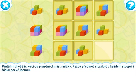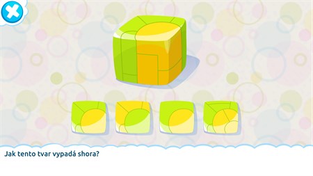 Tato naučná dětská hra obsahuje více než 20 druhů úkolů: - odhadnutí tvaru zespoda a shora - hledání dvou kusů, které dohromady dají čtverec - pokračování řady tvarů - určení ze které z dvojrozměrných sítí lze sestavit krychli - sudoku s tvary - zjištění z kolika částí se tvar skládá - hledání tvaru, který se nehodí - hledání podobných tvarů a jiné