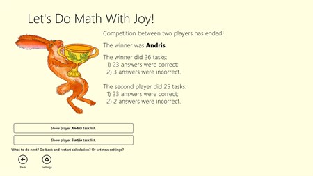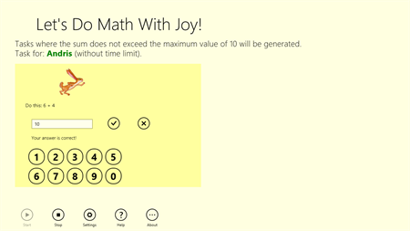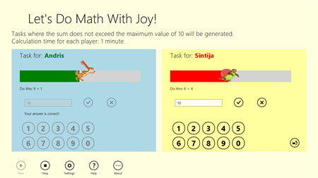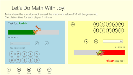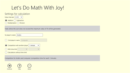 "Let's Do Math With Joy!" - it's a fast and easy way to test and strengthen your knowledge of addition, subtraction, multiplication and division. You can easily practice on your own or take a competition with friends.