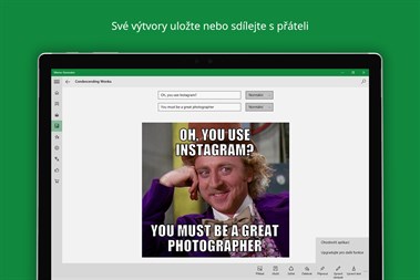 Meme-Generator vám umožňuje vytvářet svá vlastní meme. Přidejte vlastní obrázek k vytvoření zcela originálního meme, nebo si vyberte z dostupných šablon. Své výtvory uložte nebo sdílejte s přáteli.