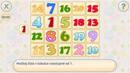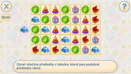 1. "Najdi všechny věci" - rozvoj soustředění 2. "Kdo má jaké číslo?" - cvičení paměti 3. "Najdi čísla" - pomáhá operativní paměti 4. "Paleta" - zlepšuje paměť 5. "Zapamatuj si obrázky" - rozvoj paměti 6. "Reakce" - cvičení selektivní pozornosti 7. "Dvojice" - trénink paměti