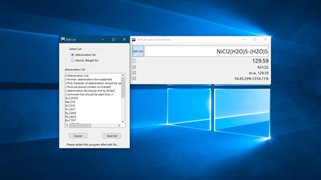 [Usage] Please input formula into input field labeled with "Enter formula here". [Enter] key will run calculation. If you input chemical formula, the program answers molecular weight, molecular formula, and elemental analysis. You can input formula with chemical formula. (eg. H2O-O=2.02) You can input +-*/^(). and numbers and alphabets. E is special character. eg. 2E3 stands for 2x10^3 [Delete] key will clear all inputed formula. Results will be stored into clip board by [ctrl]+[c] Edit List shows lists of atomic weight and abbreviation. But you can not save edited lists.