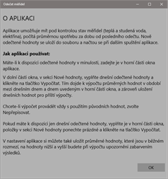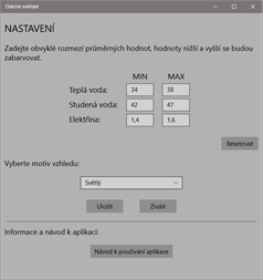 Aplikace umožňuje mít pod kontrolou stav měřidel (teplá a studená voda, elektřina, teplo), počítá průměrnou spotřebu za dobu od posledního odečtu. Nově odečtené hodnoty se uloží do souboru a načtou se při dalším spuštění aplikace.