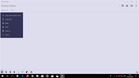 Perfect Notes a simple notepad made to add beauty and quality, the application comes equipped with functions like printing, reading aloud, scanning images among others... ____________________________ *Scaning: The application is able to read images and remove texts for creating files in .txt, supported image formats .jpg, .jpeg, .png, and .bmp. To use this function you need to select an image or drag it to the center of the application and wait for the reading to be read. _____________________________ *Print: You can print your notes in 2D application direct printers without character boundaries. _____________________________ *Extended with Perfect Scan: With this extension you can share your text with other people through Qr codes, just click "Open with Perfect Scan" so that the application sends all the text to generate a Qr code. ____________________________ In addition to these functions you will be able to discover much more buy this simple notepad and help our work. Thank you very much ;) Don't forget to rank.