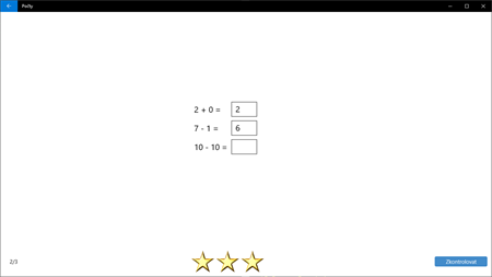 Aplikace Počty slouží k procvičování základních matematických operací +, -, * a /. Nastavit si lze rozmezí (od-do) hodnot pro jednotlivé členy příkladu, celkový výsledek, ale také mezivýpočty při postupném počítání, což je vhodné pro první třídu základní školy. Pro pokročilejší je tu možnost volby počtu členů a desetinných míst. Příklady jsou rozděleny na stránky a každá z nich je ve třech krocích postupně vyhodnocována prostřednicím hvězdiček. Nechybí však ani závěrečný celkový procentuální výsledek. Podrobný průběh každého zkoušení může být ukládán a kdykoli zpětně prohlédnut pro kontrolu. Nechybí ani možnost online testování, kdy učitel může zadat žákům test pomocí jedinečného kódu a ti mu mohou zpět poslat své výsledky.