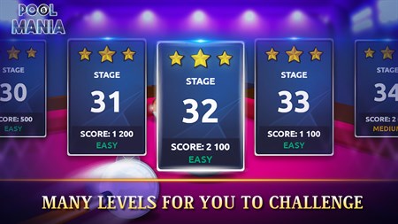 ????Exquisite Designs for Tables & Cues???? Pool Mania has a variety of Stages, each with exquisitely designed pool tables and cues. Improve the cues' abilities by upgrading them, and you will make a perfect shot in this 8 ball pool game!