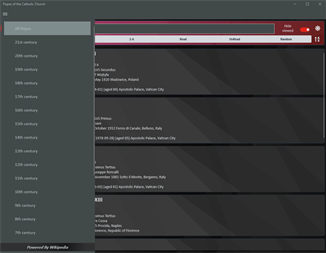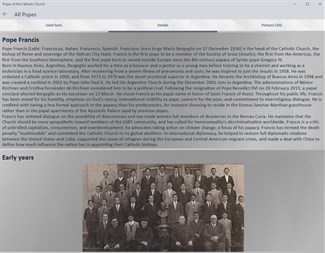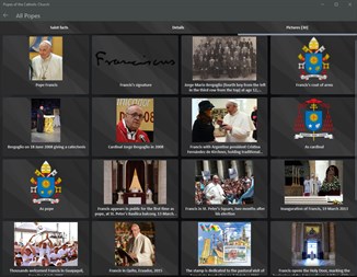 The app contains a comprehensive list of the history of the papacy in the Catholic Church, organized chronologically and searchable by the names of the popes. The app is also categorized by the century in which each pope served. Each pope's entry should include a wealth of information and details about their life and papacy, complemented by relevant images that provide context for the information