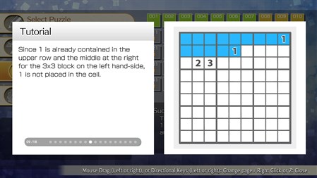 Sudoku is a puzzle in which you place numbers from 1 to 9 into a 9x9 grid, divided into horizontal and vertical lines and 3x3 blocks, filling up all of the spaces with the numbers. With everything from simple puzzles to super-difficult ones, this game is popular with a wide range of players, from beginners to veterans. Please enjoy this high-quality sudoku game.
