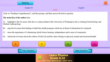 The QVprep Lite grade 10 app has ten practice tests each in quantitative and verbal ability. Each practice test has sample multiple choice questions for you to try out.