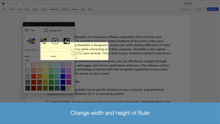 Sensory Ruler is a screen reading ruler, tinted software overlay, providing a flexible variable sized reading ruler. Colours and size of the ruler can be set from defaults to custom colours. Above and below the Ruler can be set with a different colour to contrast. Works on extended/multiple displays. Great to help with focus on lines or section of text. 15 day free trial download available from the Windows app store. One off license fee, no subscription required.