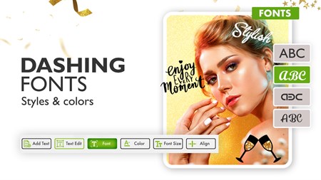 FEATURES: * Collection of Graphics, Text arts, shapes * More than 20+ advanced fonts to inspire your creation * Filters to make your pictures more attractive * Edit layers and adjust the order of layers as you want