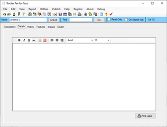 Tracker Ten for Toys is a complete windows inventory system that will help you get you organized fast. The software features advanced reporting, graph generation, item history tracking, customizable data fields, rich text format notes, data export, a powerful search engine, cost and value tracking (based on values you enter yourself) and an innovative summary view integrated with internet searching. The software can also generate full color reports, incorporating images; great for accurate insurance record keeping and automatic catalog generation. The software is ideal for both business and personal use.