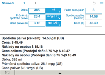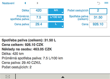 Zadejte vzdálenost (počet ujetých kilometrů), průměrnou spotřebu vozidla (l/100 km, km/L, US MPG, UK MPG) a cenu benzínu či nafty a kalkulačka Vám vypočítá kolik paliva spotřebujete a kolik ta cesta Vás bude stát (náklady na pohonné hmoty).
