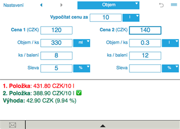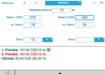 Kalkulačka rychle vypočítá cenu za jednotku zboží a kolik můžete ušetřit. Pomocí kalkulačky si budete moci v obchodě snadno vybrat nejvýhodnější nabídku.