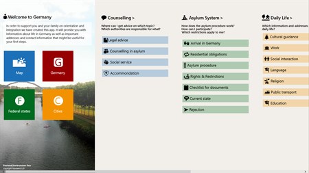 The Welcome App Germany is the central information source of for migrants, immigrants, EU citizens as well as asylum seekers and refugees living or arriving in Germany. In addition to general information about living and everyday life in Germany, the app also provides local contact information about government agencies, associations and organizations for a large number of cities and regions. The app also provides help with linguistic understanding. The content, which is constantly being further developed and expanded, is available in several languages.