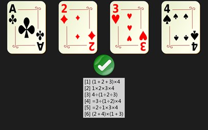 24点是一个十分流行的小游戏,其规则是:给定4个整数(范围从1到13),在数之间添加运算符(包括:加、减、乘、除和括号)构成算式,并使得算式结果为24。本应用对于给定的数,可自动求出解答个数,帮助玩家了解题目难度。并且也能够列出所有的解答算式,以帮助玩家核对答案。