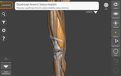 SIMPLE AND INTUITIVE INTERFACE. • Rotate and Zoom every model in the 3D space • Division by regions for a clear and immediate visual of each structure • The muscles are grouped into layers, from the superficial to the deepest • Visualization of the muscle layers in multi or single mode • Possibility to hide every single bone or muscle • Filter feature to hide or display every system • Intelligent rotation, automatically moves the centre of rotation for easier navigation • Interactive Pin allow visualization of the term relative to every anatomical detail • Hide / Show interface, ideal for use on smartphones • Muscles descriptions (origin, insertion, action), in english