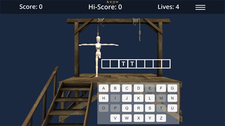 A 3D edition of the classic word game. Select letters and guess the word before the man is hung. Thousands of words. Guess in three or less tries to get a bonus. Two consecutive bonuses gives an extra life.