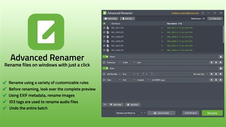 Advanced Renamer is a powerful software tool designed to streamline the process of renaming multiple files in batch. Whether you're managing personal files or handling professional projects, Advanced Renamer offers a comprehensive suite of features to efficiently organize and rename your files with ease. It's never been easier to rename several files! The names can be changed in a variety of ways by setting renaming procedures. From simple text replacements to complex renaming patterns, this application empowers users to customize their file naming conventions according to their specific needs. A number of various methods allow you to modify the names of files all at once. The files can also be copied or moved to new locations based on information in the files. Advanced Renamer lets you create new file names by adding, removing, replacing, changing case, or completely renaming the file based on previously known information about the file. Before doing anything on the files, you should confirm that the result is accurate If you rename something and then regret it, you may reverse the entire batch.