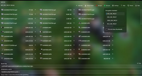 Encrypt and decrypt files in AES-256 and other standards. Process as many files of any type and size as you like at one go.
