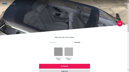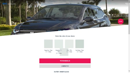 Please discover our glass range for Automotive applications. For each family of products (Windshield, Rear Window, Side Windows, Sunroof), we invite you to select a specific Glass color (clear, green, grey) and transparency (light or dark). This application lets you view glass on the vehicle, from outside or from inside the car. AGC Automotive Glass range offers optimum properties for light and energy transmission. We wish you a pleasant glass discovery trip.