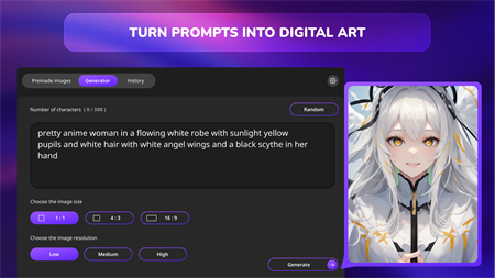 TEXT TO IMAGE Embrace the limitless possibilities of generating high-quality images effortlessly, whether through your own descriptions or with the help of pre-prepared prompts. Describe your desired wallpaper in detail, and watch the AI instantly generate a picture that perfectly captures the essence of your request.