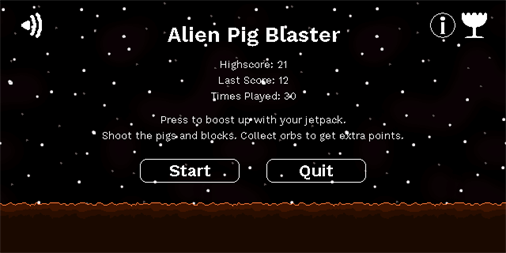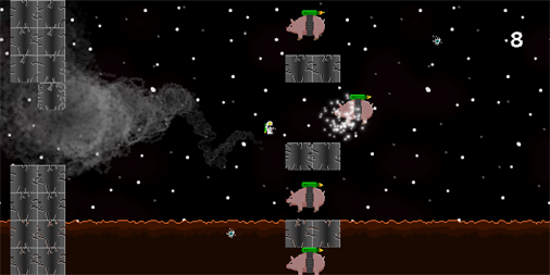 Shoot your way through the planet of the evil, flying, space pigs. Use your jet-pack to avoid endless waves of blocks and fire breathing space pigs. Blast the pigs and blocks and collect orbs to get a high-score. The game was created for the Flappy Jam. http://itch.io/jam/flappyjam