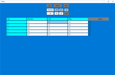 Settingボタンで遷移した画面のSaveボタンで、表示されている内容を任意の場所にファイル名を付けて保存できます。 保存した内容は、Settingボタンで遷移した画面、GetNumberボタンで遷移した画面のLoadボタンで読込めます。
