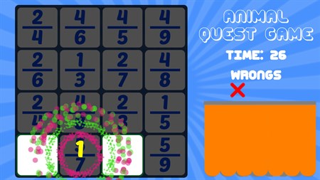 Embark on an educational journey with "Animal Quest Game"! Kids learn adding fractions while having fun. Match fractions to reveal hidden animals. Beat the timer for new records. Interactive learning for easy math understanding. Caution: 3 wrong matches lead to loss. Challenge your intellect and enjoy the thrill!