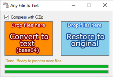Converts any file to a base64 text file. Uses simple drag and drop user interface. Send any file over the internet by email or online drive without being blocked. By converting a file to text, you can circumvent security that would otherwise block the file. "Exe" files are a good example of files that are flagged as security threats and are often blocked. Using this converter, will allow you to transmit any file over the internet with ease.